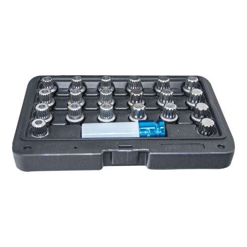 Spline style wheel nut locking keys for BMW (pre F type) models. This set is applicable to a wide range of BMW vehicles. Includes 17mm 1/2" Sq Drv master application socket.21 wheel lock keys Standard: 7Pt | 8Pt | 9Pt | 10Pt | 11Pt | 12Pt | 13 Pt | 14Pt | 15Pt | 16Pt Tamperproof: 13Pt | 15Pt | 16Pt | 17Pt | 18Ppt | 19Pt | 20Pt | 21Pt | 22Pt | 23Pt Product Detail:
